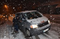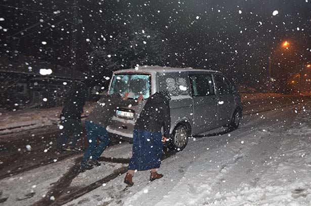 Karda yokuş çıkamayan araçlar yollarda kaldı. Vatandaşlar araçları iterek