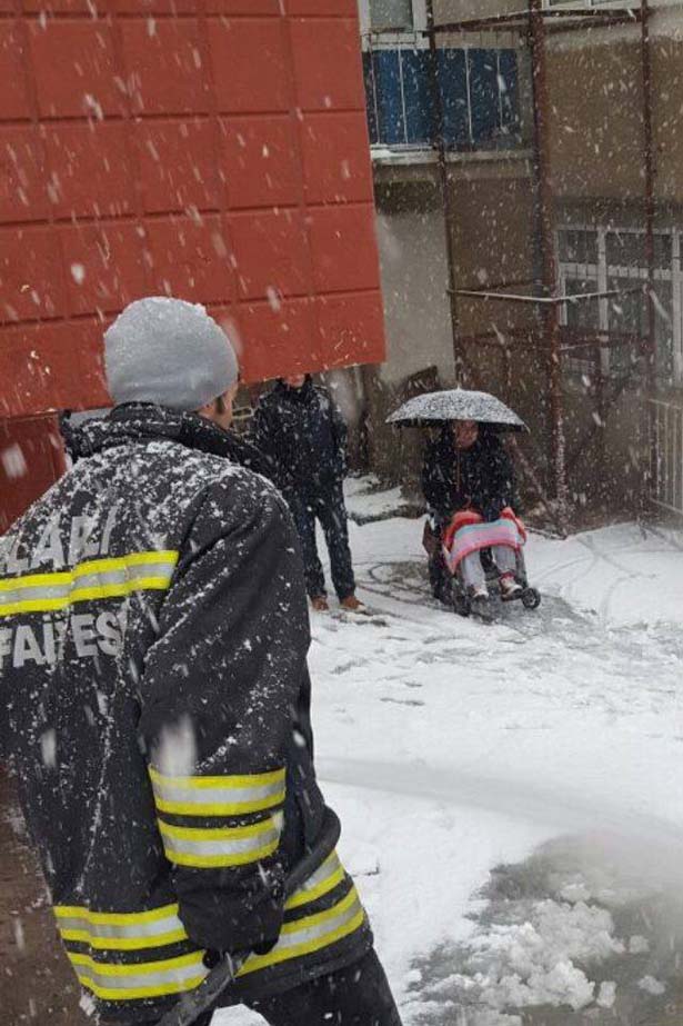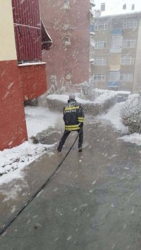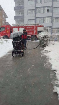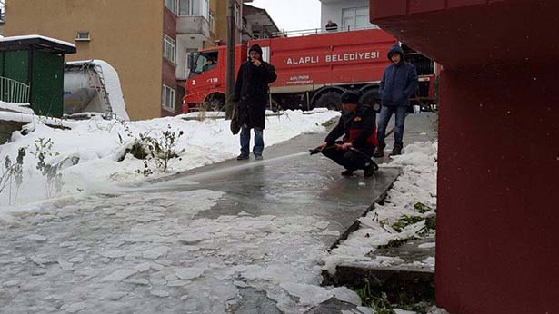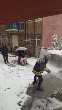 Zonguldak'ın Alaplı ilçesinde evinde mahsur kalan engelli vatandaş, Alaplı Belediyesi İtfaiye Müdürlüğü Ekiplerinin tuzlu su ile yolu yıkamasının ardından evinden çıkarıldı.
