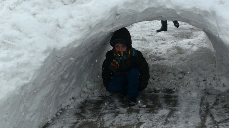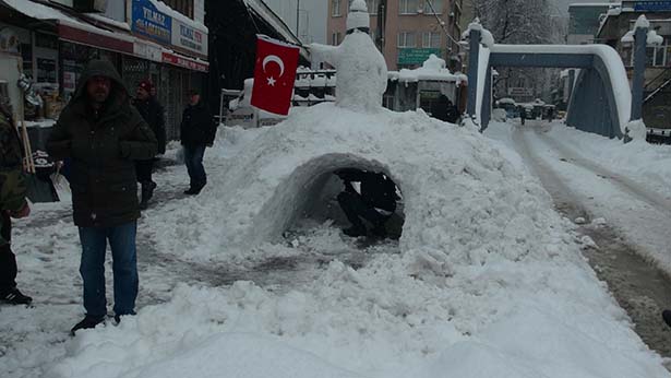 esnaf ve maden işçileri, kardan üzerinde Türk bayraklı kardan adam bulunan
