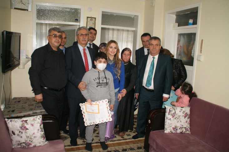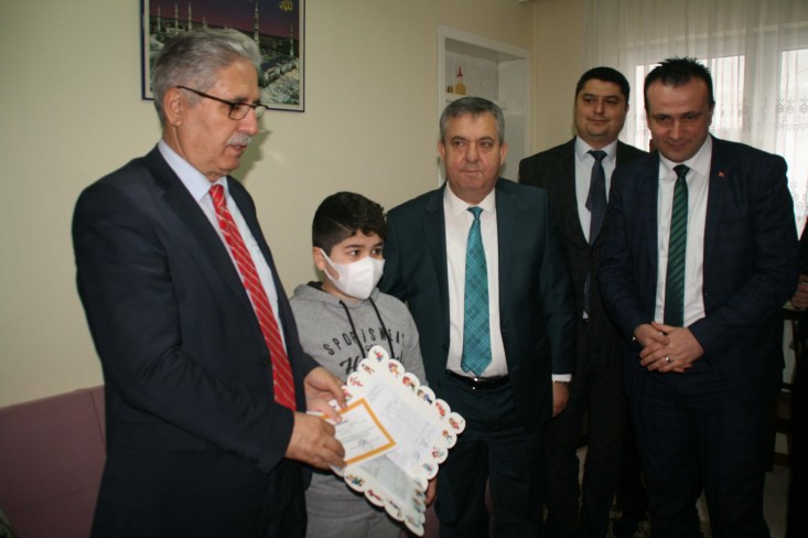 Lösemi tedavisi gören ve tedavi sürecinde kalabalık ortamlarda bulunmaması gerektiğinden evde eğitim gören Yiğit Erdoğdu,'nın babası Asım Erdoğdu, Kaymakam Madenoğlu'na oğlunun sağlık durumu hakkında bilgi verdi. Takdim etmeden önce Yiğit'in karnesini inceleyen Madenoğlu, öğrencinin başarısından duyduğu mutluluğu dile getirdi.