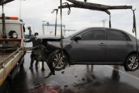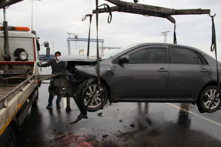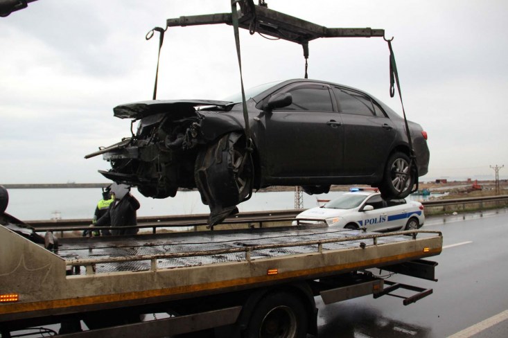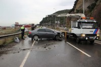 Kaza Ereğli Alaplı yolu Tersaneler bölgesinde saat 10.30 sularında meydana geldi. Alınan bilgilere göre Alaplı'dan Ereğli istikametine giden Kurban Durmuş (61) 61 VV 060 plakalı otomobil yağmur dolayısıyla kayganlaşan zeminde sürücünün viraja hızlı girmesi ile kontrolden çıktı. Orta refüje çarparak karşı şeride geçen otomobil, bariyerlere vurarak durabildi. Kazada sürücü Kurban Durmuş ile eşi Gülten Durmuş (60) yaralandı. Düğer sürücülerin haber vermesi ile olay yerine gelen sağlık ekipleri yaralı karı kocaya ilk müdahaleyi yaptıktan sonra Ereğlİ Devlet hastanesine kaldırdı. Sürücü ve eşinin hayati tehlikesinin bulunmadığı öğrenildi. Kazada hurdaya dönen otomobil çekici ile olay yerinden kaldırıldı. Polis kazayla ilgili tahkikat başlattı.