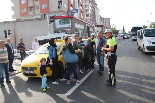 Kaza akşam saatlerinde Ömer Halisdemir bulvarında meydana geldi. Alınan bilgilere göre yolun karşısına geçmek isteyen Fatma Yılmaz (59) Devrek yol ayrımı istikametine giden Yalçın Çınar idaresinde ki 67 T 8024 plakalı ticari taksinin aynasına çarptı. Kazada yaralanan yaşlı kadının yardımına taksici Çınar ile takside ki yolcular koştu. Haber verilen ve kısa sürede olay yerine gelen sağlık ekipleri yaralı kadına ilk müdahaleyi yaptıktan sonra ambulansa alarak Ereğli Devlet hastanesine kaldırdı. Yaşlı kadın ambulansa alındığı sırada "Evlatlarım beni merak eder' diyerek göz yaşı döktü. Kaza yapan sürücü Yalçın Çınar, yaşlı kadının koşarak geldiğini ve aynasına çarparak düştüğünü söyledi. Kazayı gören yaşlı bir kadın ise kazada sürücünün hatası olmadığını söyledi. Sürücü ve görgü tanıkları ifadeleri alınmak üzere merkez polis karakoluna götürüldü. Ereğli Devlet hastanesine kaldırılan Fatma Yılmaz'ın hayati tehlikesinin bulunmadığı öğrenildi. Polis kazayla ilgili tahkikat başlattı.