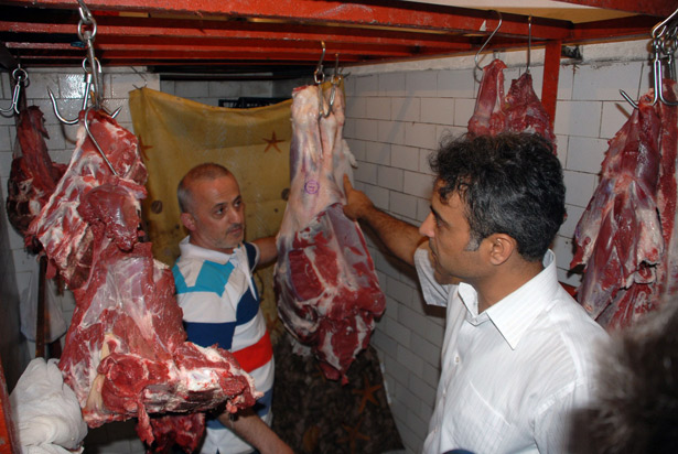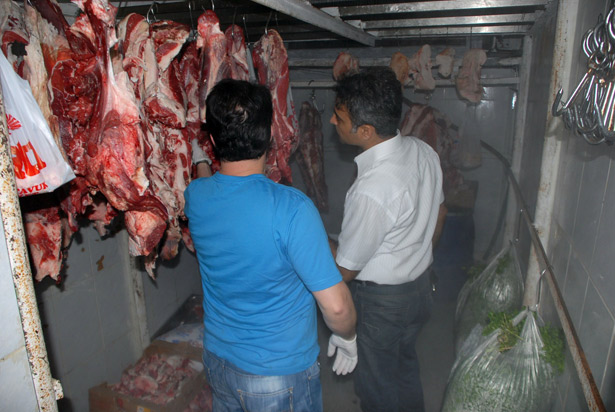 tezgahlarda ve soğutma dolaplarında bulunan etleri denetliyor. Etlerde mezbaha