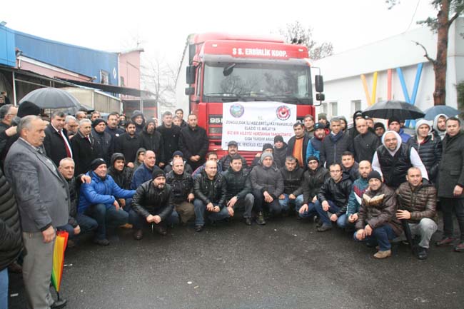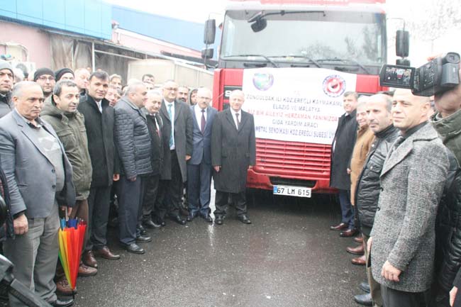 Zonguldak Valiliği talimatıyla, Karadeniz Ereğli Kaymakamlığı tarafından düzenlenen kampanya çerçevesinde Türk Metal Sendikası üye ve işçilerinin katkılarıyla hazırlanan ilk yardım tırının Elazığ’a doğru yola çıkması dolayısıyla tören düzenlendi.