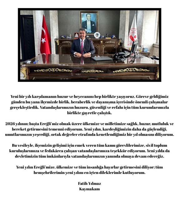 Zonguldak’ın Karadeniz Ereğli İlçe Kaymakamı Fatih Yılmaz, Yeni Yıl dolayısıyla bir mesaj yayımladı.