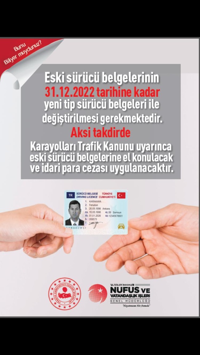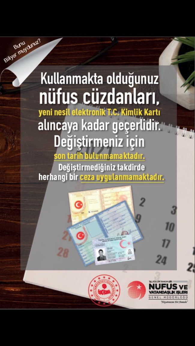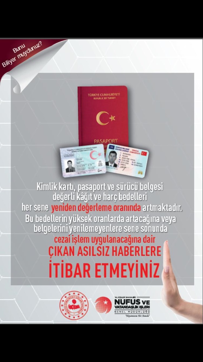 “T.C. Kimlik Kartı, pasaport ve sürücü belgesi harç ve değerli kâğıt bedelleri her yılın sonunda Hazine ve Maliye Bakanlığının belirlediği yeniden değerleme oranında arttırıldığına dikkat çekildi. Nüfus Cüzdanlarının değiştirilmesine ilişkin herhangi bir son tarih bulunmadığı, olup hali hazırda kullanılan nüfus cüzdanları yeni nesil T.C. Kimlik Kartı ile değiştirilinceye kadar geçerli olacağı ifade edilen açıklamada, "Eski Tip Sürücü Belgelerinin yeni tip sürücü belgeleriyle değiştirilmesine ilişkin son tarih ise 31.12.2022’dir. Bu sebeple medyada yer alan gerçek dışı haberlere itibar edilmemeli" denildi