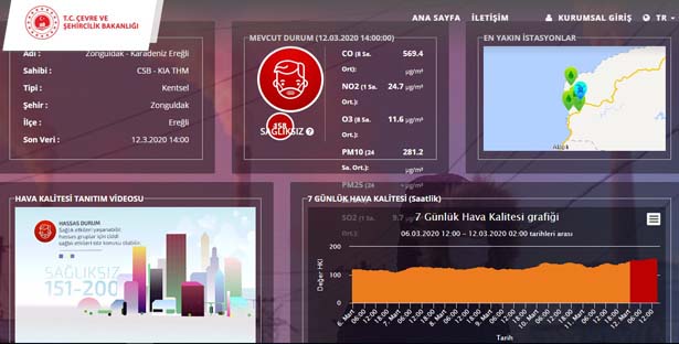 Çevre ve Şehircilik Bakanlığı’nın Hava Kalitesi Ölçümü resmi verilerine göre Kdz. Ereğli ilçesinde 5 Mart 2020 ile 11 Mart 2020 tarihleri arasında hassas seviyede olan hava kirliliği 12 Mart 2020 tarihinde sağlıksız seviyeye çıktı. Çevre ve Şehircilik Bakanlığı hava kirliği oranının 158’e çıktığını ölçerken ilçede yaşayanlar için “Herkes sağlık etkileri yaşamaya başlayabilir, hassas gruplar için ciddi sağlık etkileri söz konusu olabilir” uyarısında bulundu. Bakanlık ayrıca “Açık hava sporları için kötü bir hava, bisiklet sürmek için kötü bir hava, açık havada yürüyüş yapmak için kötü bir hava, dışarıda piknik yapmak için kötü bir hava” tespitleri yaptı.