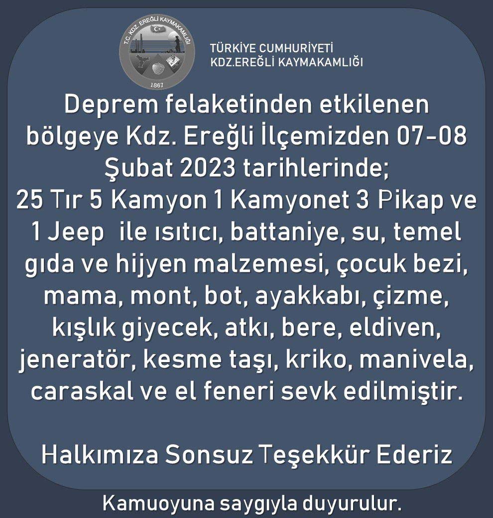 Karadeniz Ereğli Kaymakamlığı bünyesinde yapılan yardım kampanyaları deprem bölgelerine ulaştırılmak üzere yola çıktı.