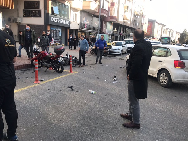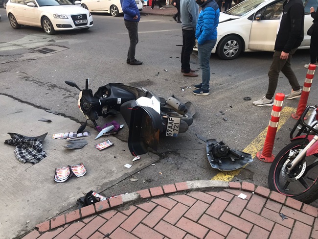 İddiaya göre, Ç.Ç. (30) idaresindeki 34 HU 4796 otomobil ile AVM otoparkına dönüş yaptığı sırada, çarşı istikametine giden İ.K. (24) idaresindeki 67 AAF 721 plakalı motosiklet ile çarpıştı. Çarpışmanın etkisi ile motosiklet sürücüsü İ.K. ve motosiklette yolcu olarak bulunan T.E. (25) yola savruldu. Kazayı gören ve yardıma koşan vatandaşlar sağlık ekiplerine haber verdi. Kısa sürede olay yerine gelen 112 ekipleri iki yaralıya yaptıkları müdahalenin ardından özel hastanelere kaldırıldı. Yaralıların tedavisine başlandığı ve otomobil sürücüsü Ç.ç.’in ifadesi alınmak üzere polis merkezine götürüldüğü öğrenildi. Kazaya karışan motosiklet sürücüsü İ.k.’nun ehliyetinin yetersiz olduğu ve motorunun da çekici vasıtası ile yedi emin otoparkına alındığı öğrenilirken, motosiklet sürücüsü ve sahibine yaklaşık 4 bin lira ceza kesildiği ifade edildi.