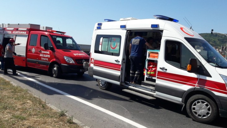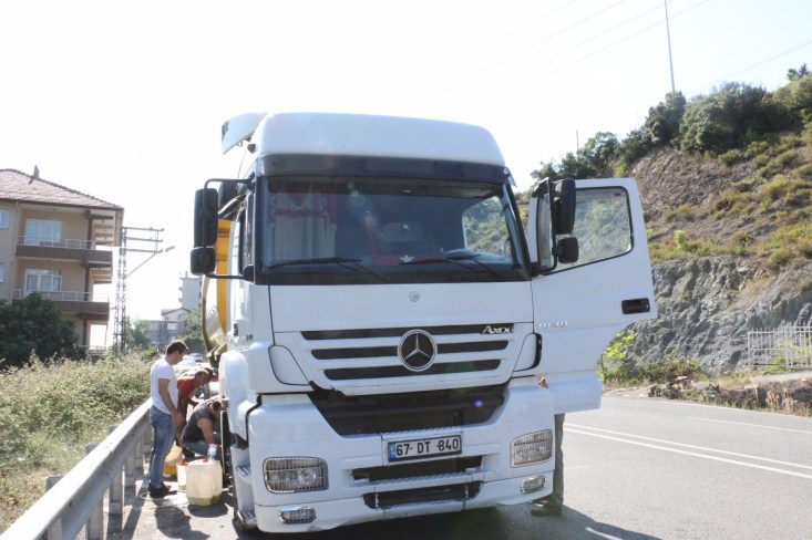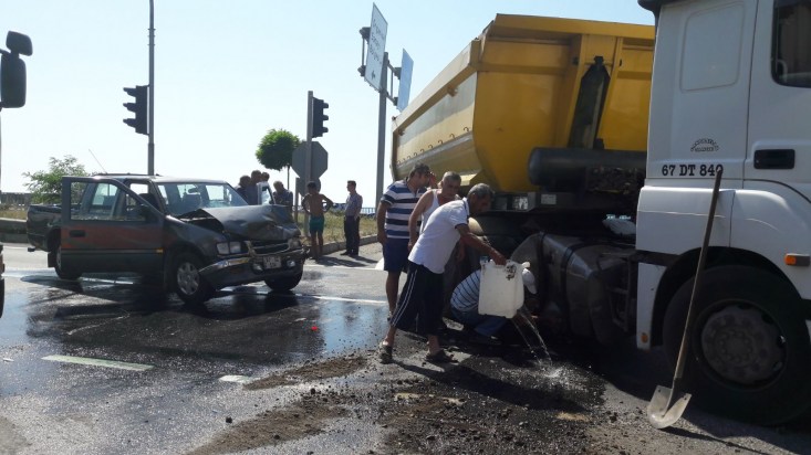 Zonguldak'ın Ereğli ilçesinde Kamyonet ve TIR'ın çarpışması sonucu meydana gelen trafik kazasında iki kişi yaralandı. Yaralanan iki kişi ambulanslarla Ereğli hastanesine kaldırıldı. Görüntüleri cep telefonu ile kaydeden kadın, kazadan sonra akan mazotu plastik şişeye doldurmak isteyen TIR sürücüne tepki gösterdi.