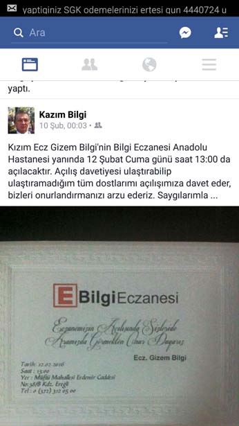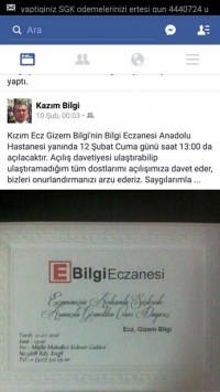 Bilgi, sosyal paylaşım sitesi üzerinden yaptığı çağrıda şu görüşlere yer verdi: "Kızım Ecz Gizem Bilgi'nin Bilgi Eczanesi Anadolu Hastanesi yanında 12 Şubat Cuma günü saat 13:00 de açılacaktır. Açılış davetiyesi ulaştırabilip ulaştıramadığım tüm dostlarımı açılışımıza davet eder, bizleri onurlandırmanızı arzu ederiz" ifadelerini kullandı.
