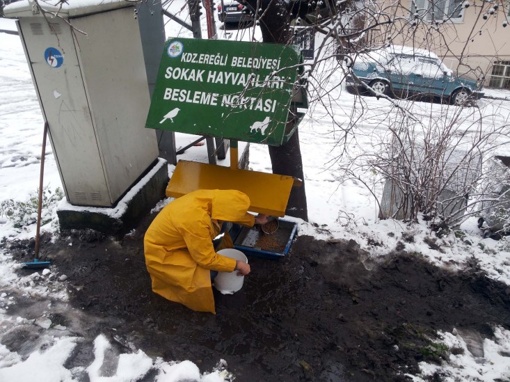 Kar yağışı ve havaların soğuması ile birlikte sokak hayvanlarının beslenme ihtiyaçlarına yönelik çalışmalara devam eden Kdz. Ereğli Belediyesi Veteriner İşleri Müdürlüğü'nden yapılan açıklamada, "Kar yağışı ve havaların soğuması ile birlikte sokak hayvanlarının beslenme ihtiyaçlarına yönelik çalışmalara devam edilmektedir. Ayrıca duyarlı vatandaşlarında sokakta yaşayan sahipsiz hayvanların açlık çekmemeleri için bu çalışmalara katkı sağlayacaklarına inanmaktayız."denildi.