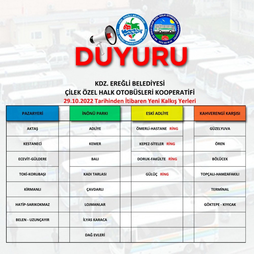 Yapımına başlanılacak olan yeni Hükümet konağı binası inşaat alanında faaliyet gösteren Kdz. Ereğli Belediyesi 92 Nolu Çilek Özel Halk Otobüsleri Motorlu Taşıyıcılar Kooperatifi, 29 EKİM 2022 tarihinden itibaren ekli listede belirtilen alanlardan hizmet veremeye devam edeceklerdir.