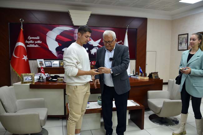 Belediye Başkanı Halil Posbıyık, 16 Kasım’da Amerika’da düzenlenecek Dünya Şampiyonasına katılacak genç sporcu Ömer Faruk Darçın ve eşi Gözde Darçın’ı makamında misafir ederek ödülünü takdim etti.