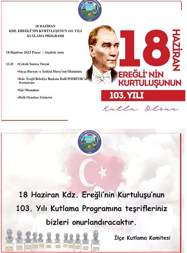 Karadeniz Ereğli Kaymakamlığı’ İlçe Kutlama Komitesi’nce “18 Haziran Ereğli’nin Kurtuluşunun 103. Yılı ” dolayısıyla kutlama programı hazırlandı. Kutlama programı şöyle; 18 Haziran Pazar günü 13.30’da Atatürk Anıtı’na çelenk sunulacak. Saygı duruşunda bulunulmasının ardından İstiklal Marşı söylenecek. Ardından Belediye Başkanı Halil Posbıyık bir konuşma yapacak. Program. Şiir okunması ve halk oyunları gösterileri ile sona erecek.