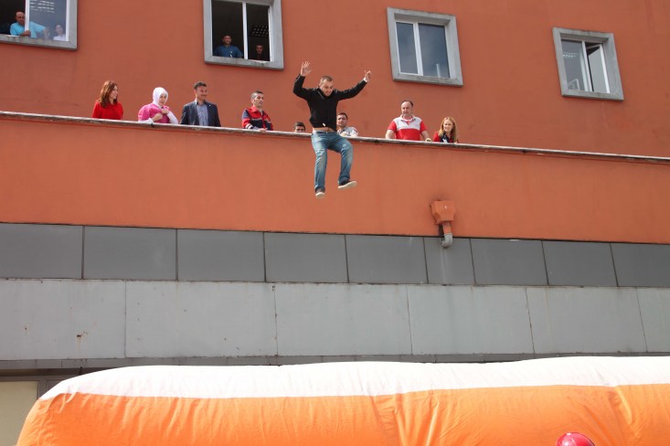 indirilmesinin ardından binada mahsur kalan çalışanlar hava yastığına atlayarak