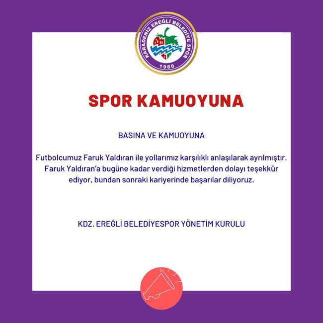 Kdz.Ereğli Belediyespor oyucularından Faruk Yaldıran takımdan ayrıldığı duyuruldu.