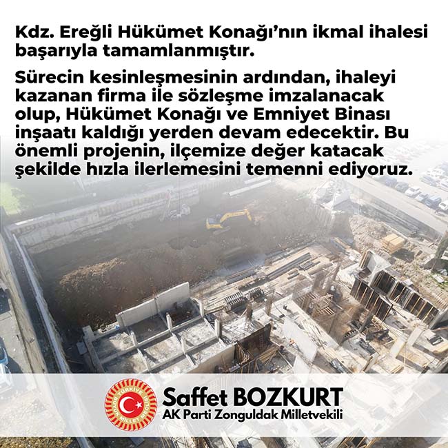 AK Parti Zonguldak Milletvekili Saffet Bozkurt, 9 yıl önce yapımına başlanan Kdz. Ereğli Hükümet Konağının ikmal ihalesinin tamamlandığını duyurdu.