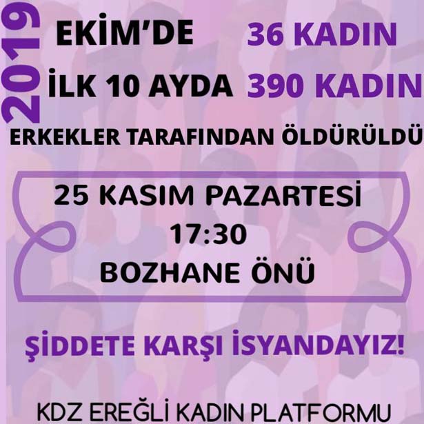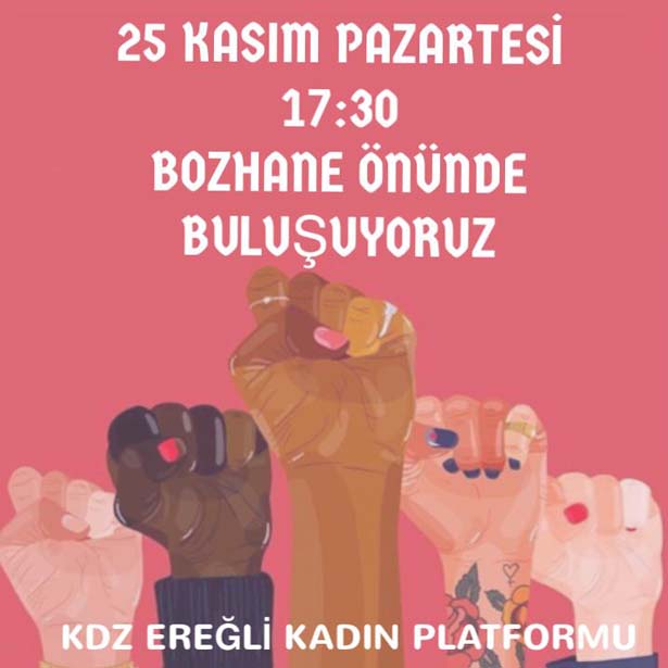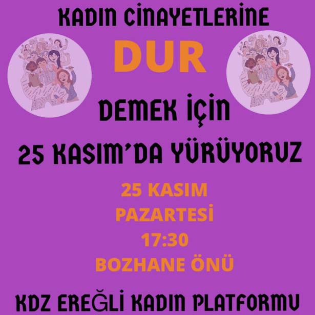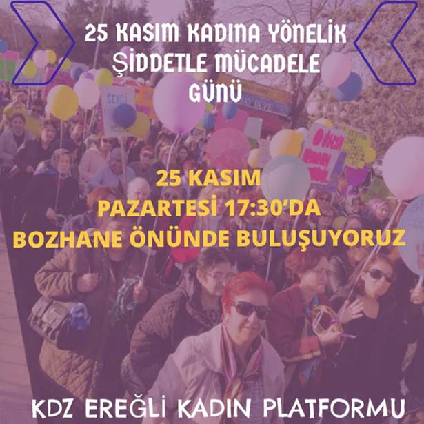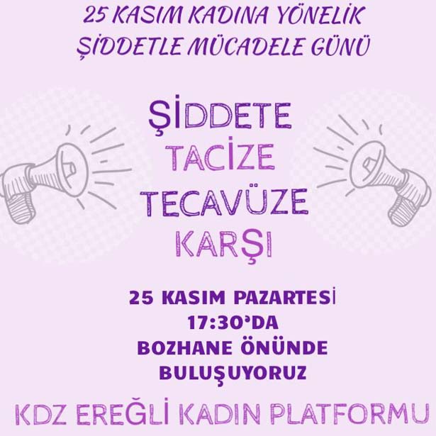 Karadeniz Ereğli Kadın Platformu, "25 Kasım Kadına Yönelik Şiddete Karşı Uluslararası Mücadele ve Dayanışma Günü" etkinlikleri düzenleyecekleri bildierildi.