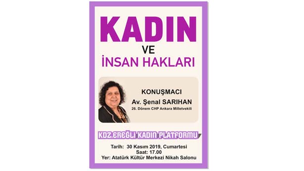 30 Kasım Cumartesi günü saat 17.00 AKM Nikah Salonunda Av. P. Mine Yılmaz Moderatörlüğünde 26. Dönem CHP Milletvekili Av. Şenal Sarıhan'ın katılımıyla "Kadın ve İnsan Hakları" konulu söyleşi yapılacaktır.”