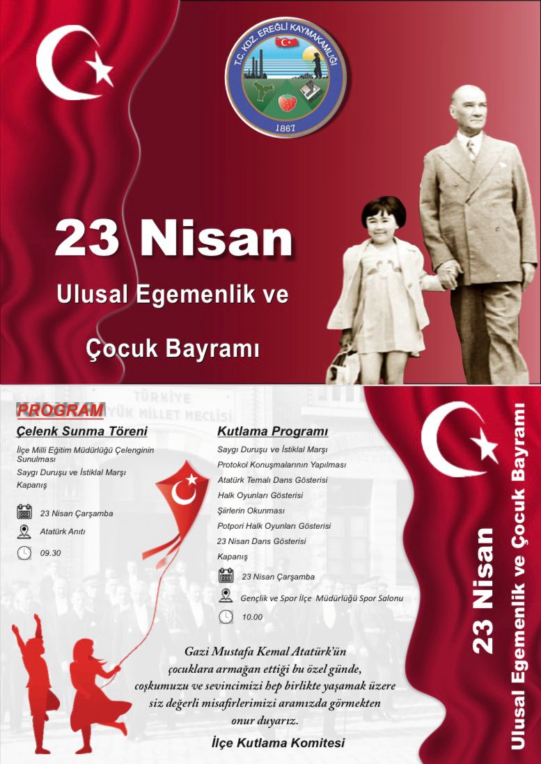 23 Nisan Ulusal Egemenlik ve Çocuk Bayramı tüm yurtta olduğu gibi Kdz.Ereğli’de de çeşitli tören ve etkinliklerle kutlanacak.