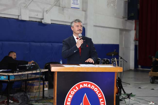 Törende konuşan Okul Müdürü Faruk Yavuzyiğitoğlu, Karadeniz Ereğli Anadolu Lisesi’nin 1981 yılında başladığı eğitim-öğretim faaliyetlerini yaklaşık 45 yıldır sürdürdüğünü belirtti ve "Okulumuz, hizmet verdiği öğrencilerini akademik ve sosyal anlamda nitelikli bireyler olarak yetiştirmek için uğraş vermektedir. Yaklaşık 8 bin mezunumuzun çoğu, ülkemizin ve dünyanın önemli firmalarında, üniversitelerinde, ticari ve sosyal yaşamında görevler üstlenmektedir. Bugün ailemize yeni katılan öğrencilerimiz, bu aidiyetin simgesi olarak rozet takacaklar. Bu rozet, aynı zamanda dayanışma ve yardımlaşma kültürünün bir parçası olmayı da ifade ediyor.” dedi.
