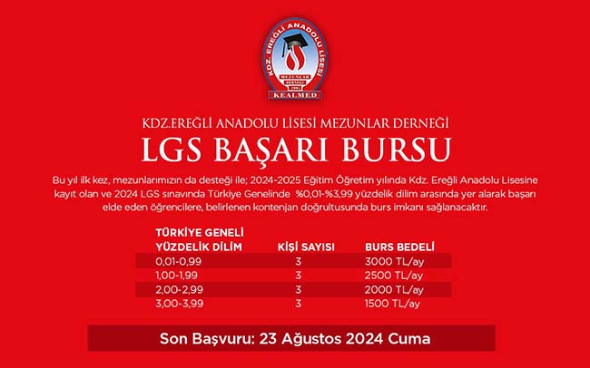 Kdz.Ereğli Anadolu Lisesi Mezunlar Derneği bu yıl ilk kez, Liselere Geçiş Sınavında başarı gösteren ve Kdz.Ereğli Anadolu Lisesine kayıt yaptıran öğrencilere, yüzdelik dilimdeki başarı derecelerine göre 1500 ile 3000 TL arasında burs imkanı sağlayacak.