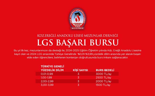 Bu çalışmalar kapsamında bu yıl başlatılacak “KEALMED LGS Başarı Bursu Programı” ile; 2024-2025 Eğitim Öğretim yılında 2024 LGS sınavında, Türkiye genelinde %0,01-%3,99 yüzdelik dilim arasında yer alarak başarı elde eden ve Kdz. Ereğli Anadolu Lisesine kayıt olan öğrencilere burs imkanı sağlanacak. Program sayesinde başarı sağlamış öğrencilerin teşvik edilmesi, eğitimlerine katkı sağlanması ve öğrencilerin daha fazla desteklenmesi hedefleniyor.