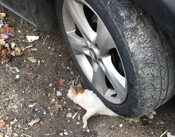 Umursamaz yada dalgın olan otomobil sürücüsü, ön lastiğinin altında ezdiği kediye rağmen aracını park ederek olay yerinden ayrıldı.