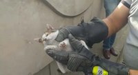 Zonguldak'ın Ereğli ilçesinde üst geçitin beton blok arasına sıkışan yavru kedi ekipler tarafından kurtarıldı.