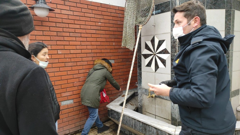 Zonguldak’ın Ereğli ilçesinde çeşme ile iş yeri arasında ki boşlukta sıkışan yavru kedi, itfaiye ekiplerince kurtarıldı.