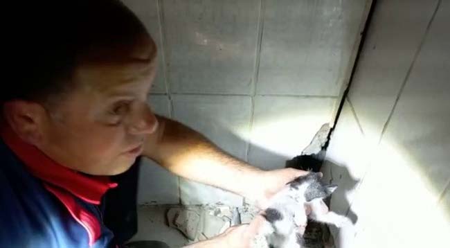 Zonguldak'ın Kozlu ilçesinde iki duvar arasına sıkışan yavru kediyi kurtarmak için mücadele veren itfaiye ekipleri, kurtardıkları kediyi "Oy benim tatlım, kıymetlim" diye sevdi.