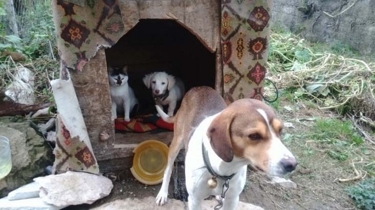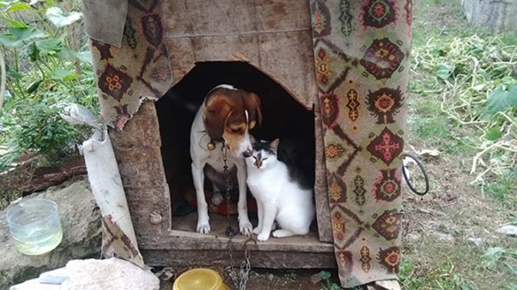 ilçesine bağlı Hasbeyler Köyünde kedi ile iki köpek aynı kulübeyi paylaşıyor,