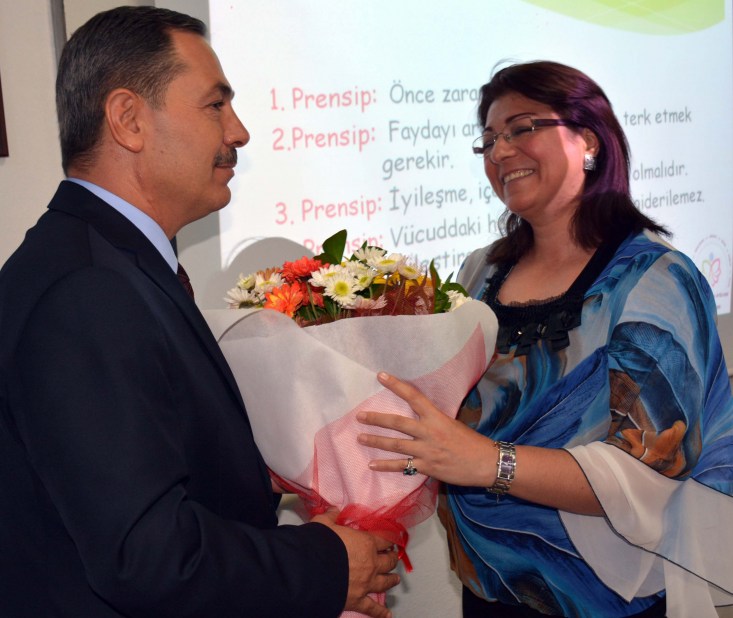 Şebnem Yıldırım'a çiçek vererek başarılarının devamını