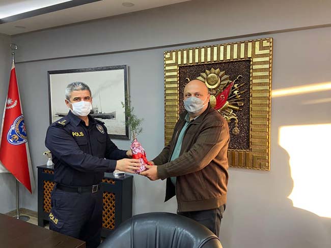 Kent Konseyi Başkanı Osman Yavuz, Emniyet Müdürü Ünlü’ye tüplü çam fidanı armağan etti ve İlçenin sorunları hakkında fikir alışverişinde bulundu.