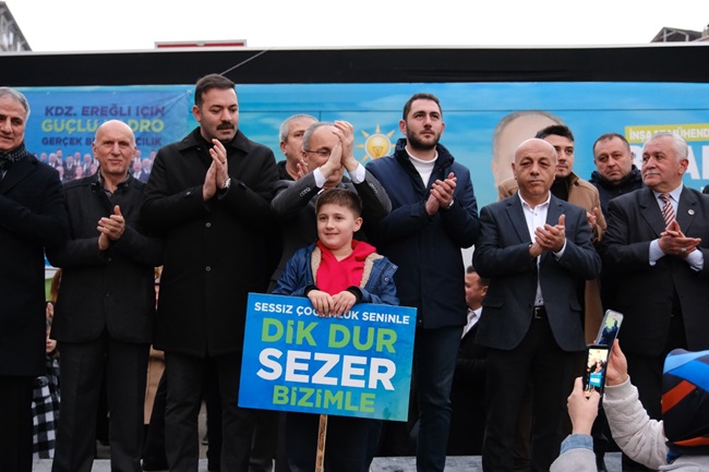 “Kaybedecek 5 yılımız Yok!” sloganının üzerinde duran Ak Parti Belediye Başkan Adayı İbrahim Sezer, projelerini açıkladığı konuşmasında, “Herkesin kataloglara koyduğu ve hayata geçiremediği KENT MEYDANI’nı yapmaya geliyoruz. Sel felaketinde büyük hasara uğrayan, mevcut yönetimin yapabilmek için İstanbul Büyük Şehir Belediyesi’nden medet umduğu ve bu yaza yetiştiremeyeceği SAHİLİMİZİ yeni yüzüyle yapmaya geliyoruz. Kdz. Ereğli’ye Spor Bakanlığı imkanlarıyla büyük bir STADYUM kazandırmaya geliyoruz. Kdz.Ereğli’ye Aile ve Sosyal Politikalar Bakanlığı imkanlarıyla YAŞLILARA BAKIM VE REHABİLİTASYON MERKEZİ kazandırmak için geliyoruz. Kdz. Ereğli’de gençlerimizin kötü alışkanlıklara bulaşmaması için sosyal ve kültürel etkinliklerini geliştirebilmek için BELEDİYE KONSERVATUARINI yapmaya geliyoruz. Kdz.Ereğli’nin düzgün planlanmaması, sorunlarının hep ötelenmesi nedeniyle bugün kronik hale gelen TRAFİK SORUNUNU çözecek ciddi projeleri hayata geçirmeye geliyoruz. 5 yıldır yapacağız diyerek yapamadıkları, şehrin ve belediyenin kaynaklarını menfaatlerine kullanmak amacıyla her tür haltı yiyen, vatandaşımızın arsasında, toprağında gözü olan çıkar ve menfaat guruplarına hizmet etmek amacıyla hazırlık yapılan İMAR REVİZYONUNU vatandaşlarımızın haklı taleplerini ve menfaatlerini koruyarak yapmak için geliyoruz!” dedi.