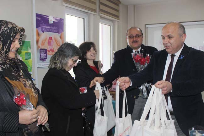Zonguldak İl Sağlık Müdürlüğü Halk Sağlığı Hizmetleri Başkanlığına bağlı Kanser Erken Teşhis, Tarama ve Eğitim Merkezinde (KETEM) de görevli Sağlık Personellerine ve Tedavi için gelen Kadınlara 8 Mart Dünya Kadınlar Günü nedeniyle düzenlenen etkinlikte Vali Yardımcısı ve İl Sağlık Müdürü Uzm. Dr. Ertuğrul Güner tarafından karanfil, erken teşhis hayat kurtarır logolu şapka ve sağlıklı yaşam için hareket logolu bez çanta hediye ederek kadınlar gününü kutladılar.