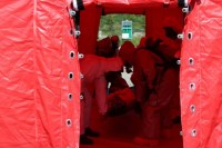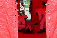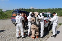 özel elbiselerini giyerek çevrede kimyasal ölçümü yaptı. Olay yerinin