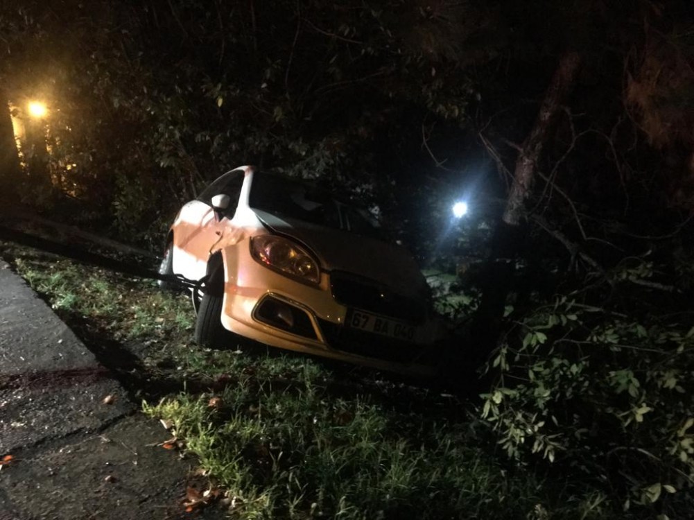Zonguldak'ın Ereğli ilçesinde sürücüsünün direksiyon hâkimiyetini kaybettiği kiralık otomobil önce Eski Bağlık Kantinin kapısına çarptı, virajı alamayarak çalılıklara uçtu. Polis ekipleri kaza sonrası olay yerinden kaçan sürücü için arama çalışması başlatıldı.