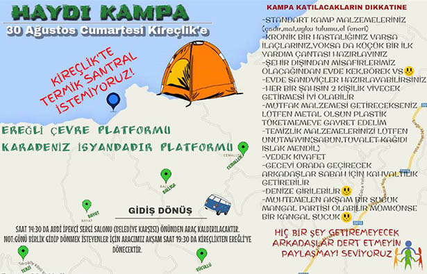 Karadeniz. Ereğli Çevre Platformu ve Karadeniz İsyandadır Platformu işbirliğiyle, Karadeniz Ereğli'ye bağlı Bayat ve Ballıca köyleri arasında bulunan Kireçlik Koyu'na yapılması planlanan termik santral tehlikesine dikkat çekmek amacıyla kamp düzenleniyor.