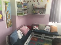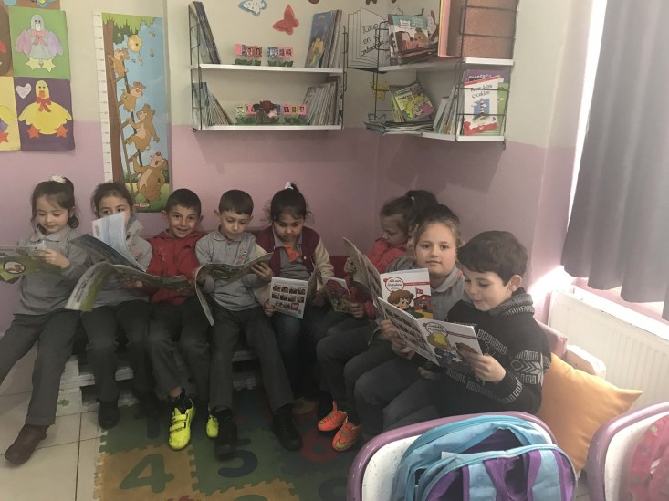 atık malzemelerden yapılan okuma köşesinde öğrenciler her gün bir ders saatinde
