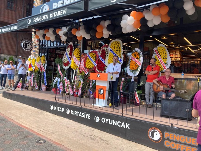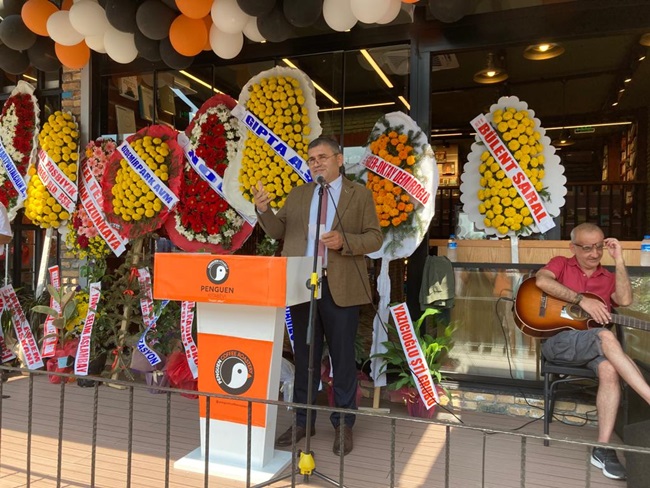 “ Hızlı bir şekilde bugün resmi açılışımızı yapıyoruz. Şu an kadim bir kentin eski deniz surlarının üstünde bulunuyoruz. Deniz her zaman ufuktur, ufkumuzun açık olması gerekiyor. Penguen kitabevi de Ereğli’de ufkumuzu açık tutmak için bir nebze katkı sunabilirse bize yeterli olacaktır diye düşünüyorum. Kitabevimizin temel hedeflerini üç başlıkta toplayabiliriz. Birincisi çocuklarımızın, gençlerimizin kitapla, bilgiyle temasını sağlamak, burada geldiklerinde rahat bir ortamda hem okumalarını, hem çalışmalarını, farklı aktivitelerde bulunduğu bir ortam olmasını, kısaca bir eğitim merkezi olmasını istiyoruz. İkincisi sosyal bir merkez olmasını istiyoruz. Sadece kitap alıp gittiğiniz değil, insan ilişkilerinin geliştiği, birlikte sosyalleştiğimiz bir alan olmasını istiyoruz. Nihayetinde de ticari bir merkez, bu da hayatın bir gerçeği.”
