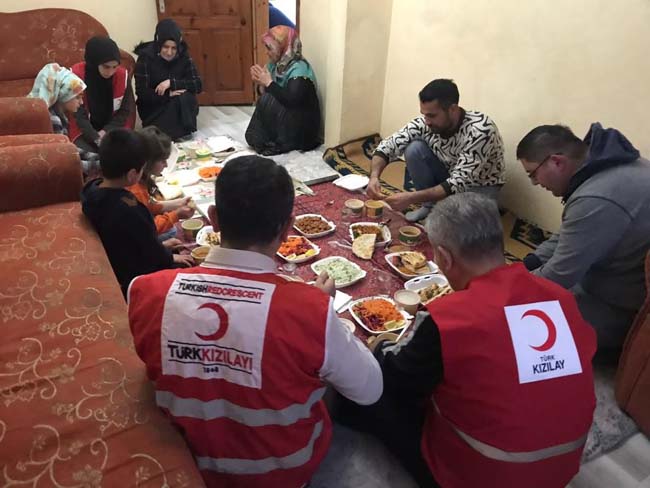 Türk Kızılayı Kdz. Ereğli Şube Başkanı Kürşat Yağız, Başkan Yardımcısı Ramazan Toprak, Kızılay gönüllüsü Selçuk Altın ile Kızılay gönüllüsü gençlerle iftar programında bir ailenin evine konuk oldu. Çocuklarla birlikte iftar yapan Başkan yağız ve beraberindekiler daha sonra çocuklara giysi ve oyuncaklar hediye etti. İftar da çocukları sevindirmenin mutluluğunu yaşadıklarını dile getiren Başkan Yağız “Türk Kızılayı olarak bizler yaptığımız yardımların yanı sıra sosyal aktivitelerde yapıyoruz. Geçtiğimiz haftalarda özel çocuklarımıza yönelik olarak etkinlikler düzenlemiştik. Bu akşamda Ramazan ayı nedeniyle belirlediğimiz bir ailenin evinde iftara konuk olduk. Onlarla birlikte aynı sofrada bir araya geldik. İftar sonrasında ise Kızılay gönüllüsü gençlerimiz evde bulunan çocukları baştan aşağı giydirip giysiler ve oyuncaklar hediye ettik. Paylaşmanın arttığı Ramazan ayında çocuklarımızı sevindirmek istedik. Bizleri bu akşam sofrasında konuk edip ekmeğini paylaşan ailemize çok teşekkür ediyorum” dedi.