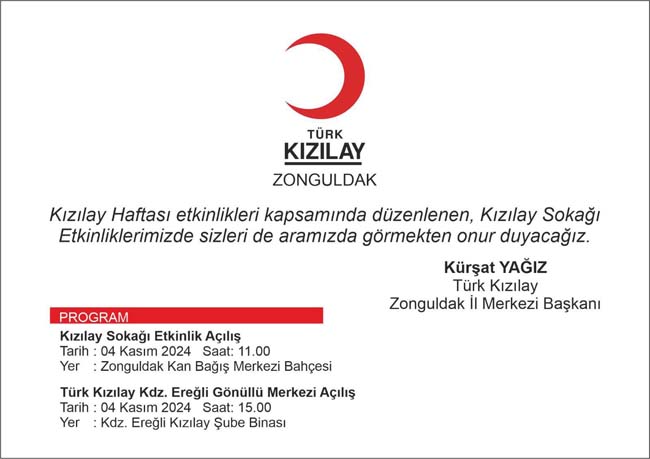 Bu vesile ile tüm Zonguldak halkımızı ve gönüllülerimizi Kızılay Haftası kutlamaları kapsamında 4 Kasım 2024 günü saat 11.00’de Zonguldak Kızılay Kan Merkezi Bahçesi, aynı gün saat 15.00’te Türk Kızılayı Kdz. Ereğli Şube binamızda Türk Kızılayı Kdz. Ereğli Gönüllü Merkezi açılışı etkinliklerimize davet ediyorum.
