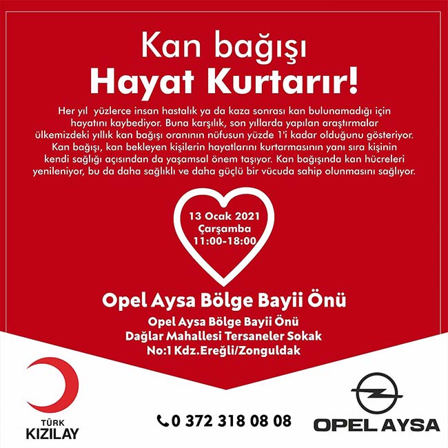 Kan Bağışı Kampanyası 13 Ocak 2021 Çarşamba günü 11.00-18:00 saatleri arasında Opel Aysa önünde yapılacak.