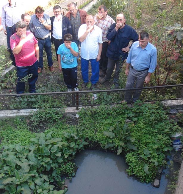 Kanalizasyon kuyusunun başında toplanan lojman sakinleri, burunlarını tutarak