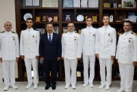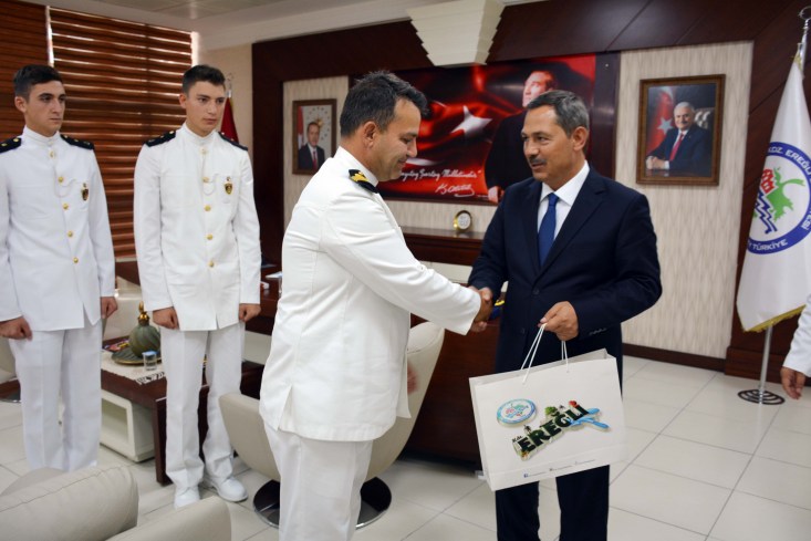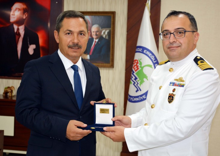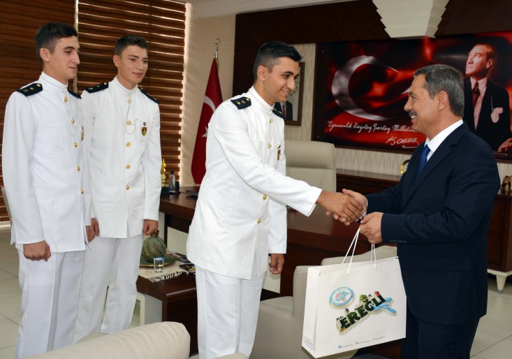 TCG Bayraktar adlı askeri gemiyle limanı ziyaret eden Deniz Harp Okulu öğrencileri ve gemi komutanları başkanlık makamında Karadeniz Ereğli Belediye Başkanı Hüseyin Uysal ile bir araya geldi.