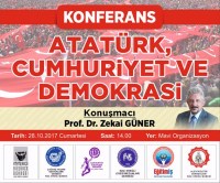 28 Ekim Cumartesi günü saat 14.00'de Mavi Organizasyon'da Prof. Dr. Zekai Güner'in konuşmacı olarak katılacağı ''Atatürk, Cumhuriyet ve Demokrasi'' konulu konferans düzenlenmiştir.
