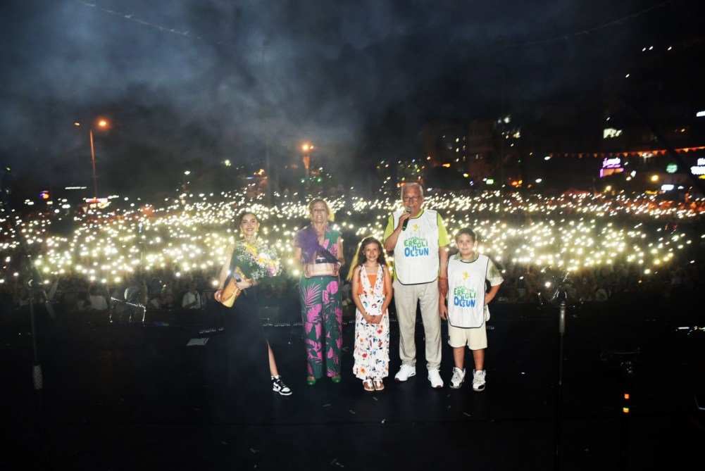 Belediye Başkanı Halil Posbıyık, sanatçılara çeşitli hediyeler takdim ettikten sonra onbinlerle birlikte “Sevgi, Barış, Dostluk..Ereğli İl Olsun” diye haykırdı.