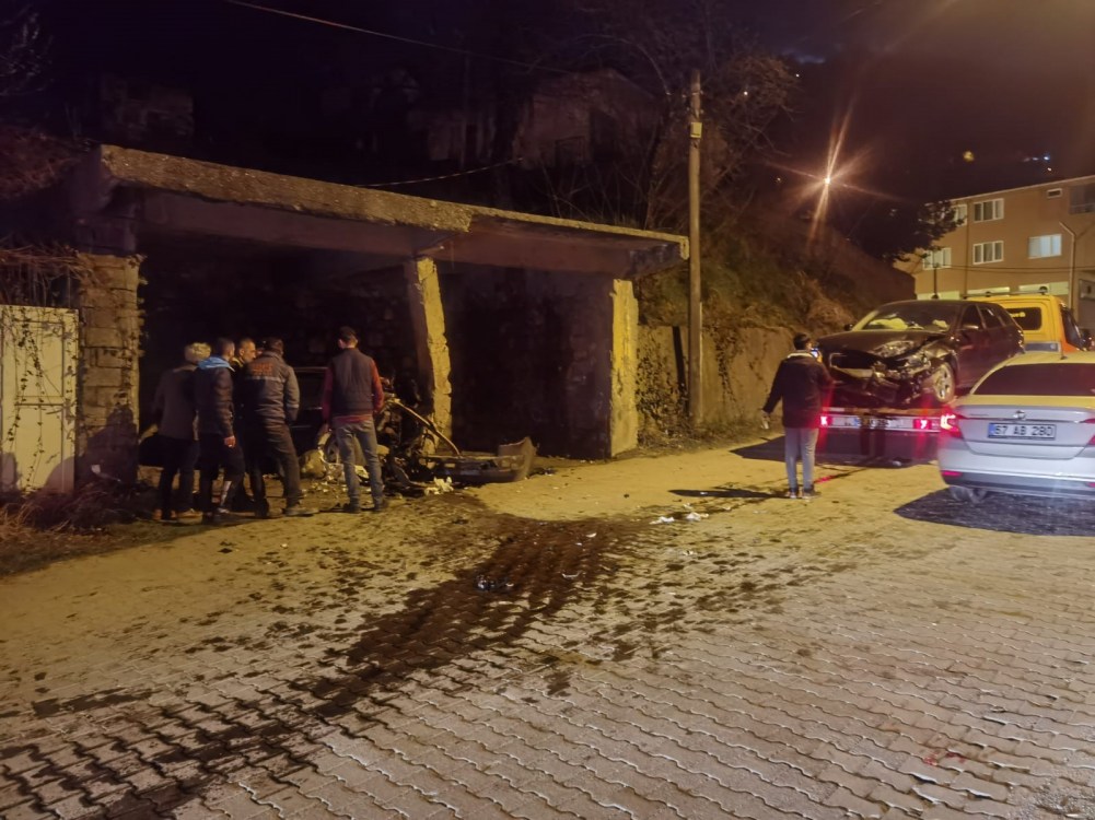 Zonguldak'ta seyir halindeyken kontrolden çıkan bir otomobil yol kenarındaki garajda park halinde bulunan otomobili adeta hurdaya çevirdi.